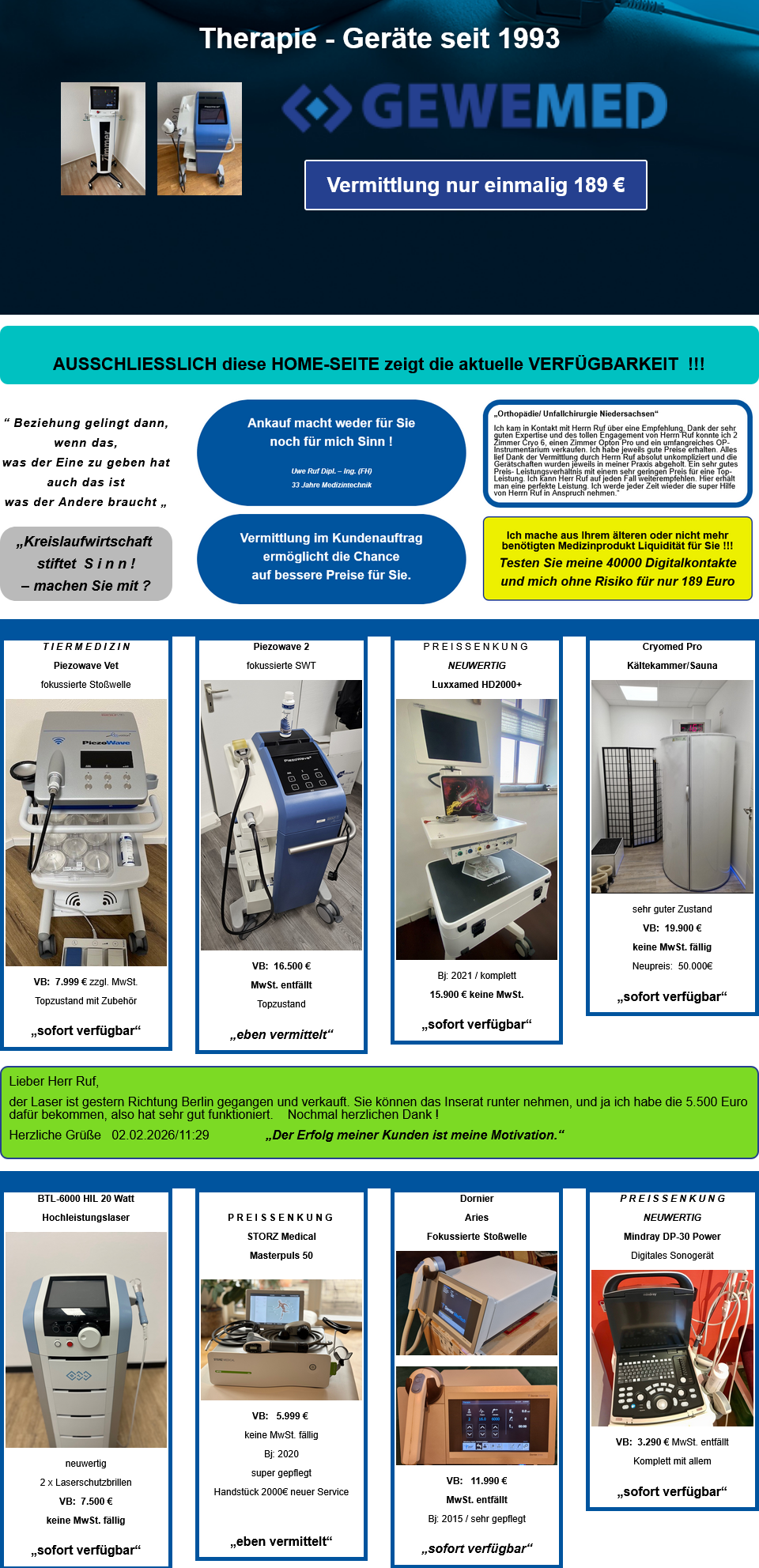 GEWEMED ist seit 1993 speziallisiert auf Medizintechnik mit Schwerpunkt auf Therapiegeräte der Firma Zimmer MedizinSysteme, BTL Medizintechnik, Piezowave, STORZ, Dornier, K-Laser, Luxxamed, Asthetische Medizin, Praxis-Auflösungen und viellerlei medizinischer Artikel.